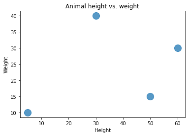 plt.scatter(df['weight'], df['height'], s=200, alpha=0.75) # s:size of dot; alpha=transperancy of dot