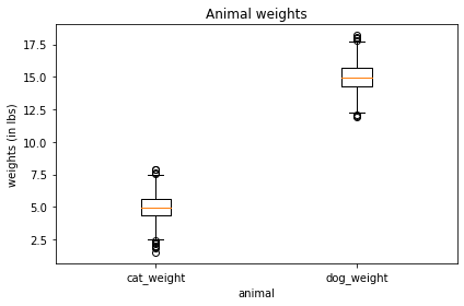 plt.boxplot(cols, labels=['cat_weight', 'dog_weight'] )
